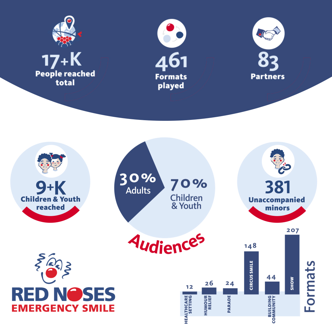 In 2025, our teams carried the art of clowning into shelters, camps and community spaces, reaching 17,746 people alongside more than 83 incredible partner organisations. Through 461 different artistic interventions, we offered moments of psychosocial support to people living through forced displacement. On paper, these numbers tell one story.