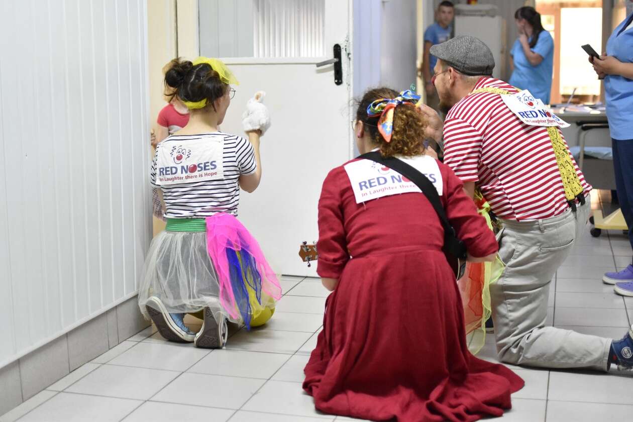 With I Mariupol, an organisation supporting people displaced from Mariupol, the team prepared a lively show and activities for children and their mothers, followed by a Humour Relief Workshop for the staff themselves.