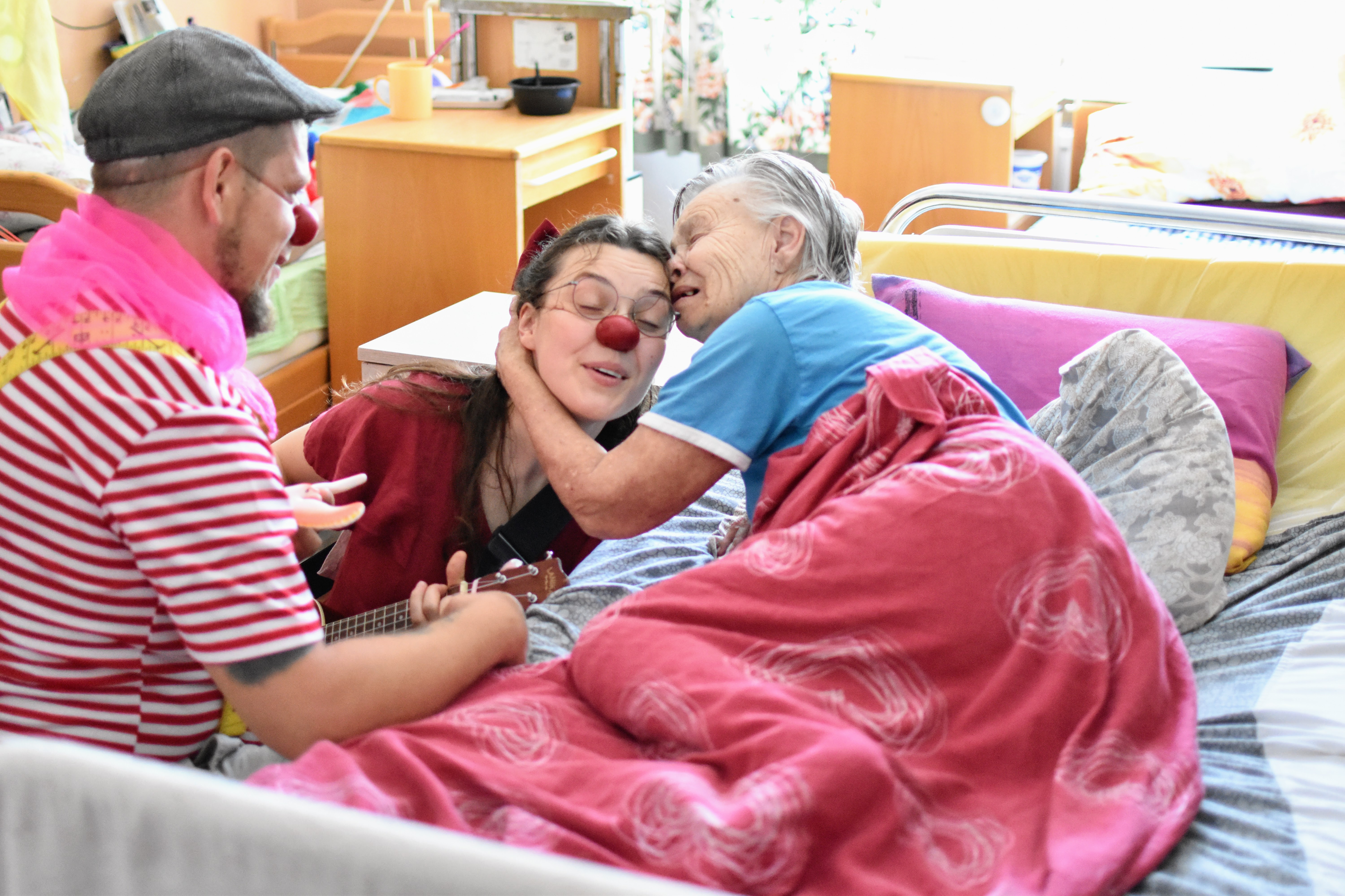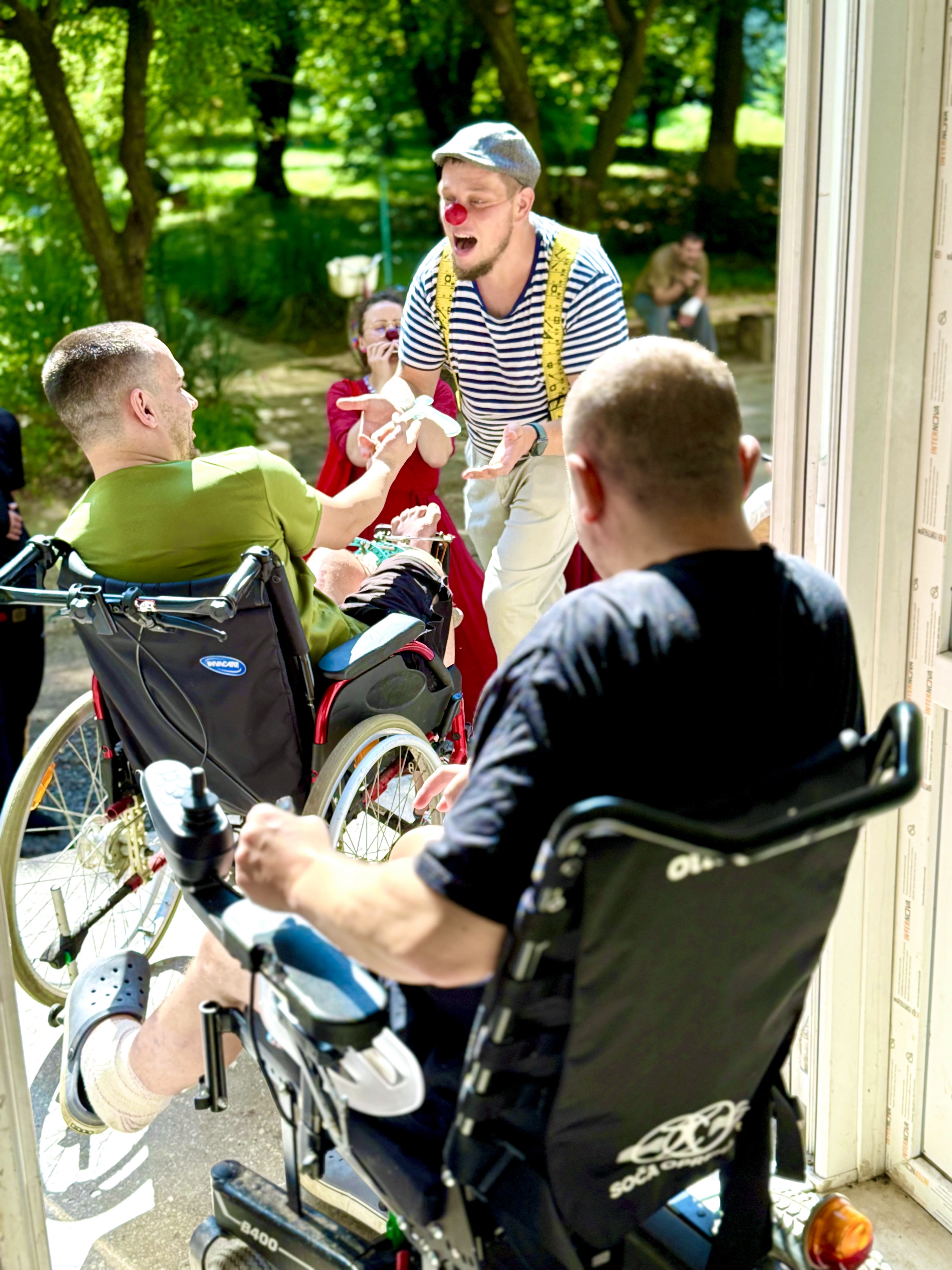 The region has become a refuge for huge numbers of people evacuated from other parts of the country: mothers with children, those who have lost their homes, the injured, older people, orphans, and children and adults with disabilities. Many have endured the horrors of war first-hand and now depend on support—yet local services are stretched to the limit. That’s why our healthcare clown trio—Michal, Marija and Vaiva—together with Veronika Kočišová as Head of Mission, spent an entire month bringing lightness, encouragement, and connection to communities of internally displaced persons (IDPs) from eastern Ukraine.