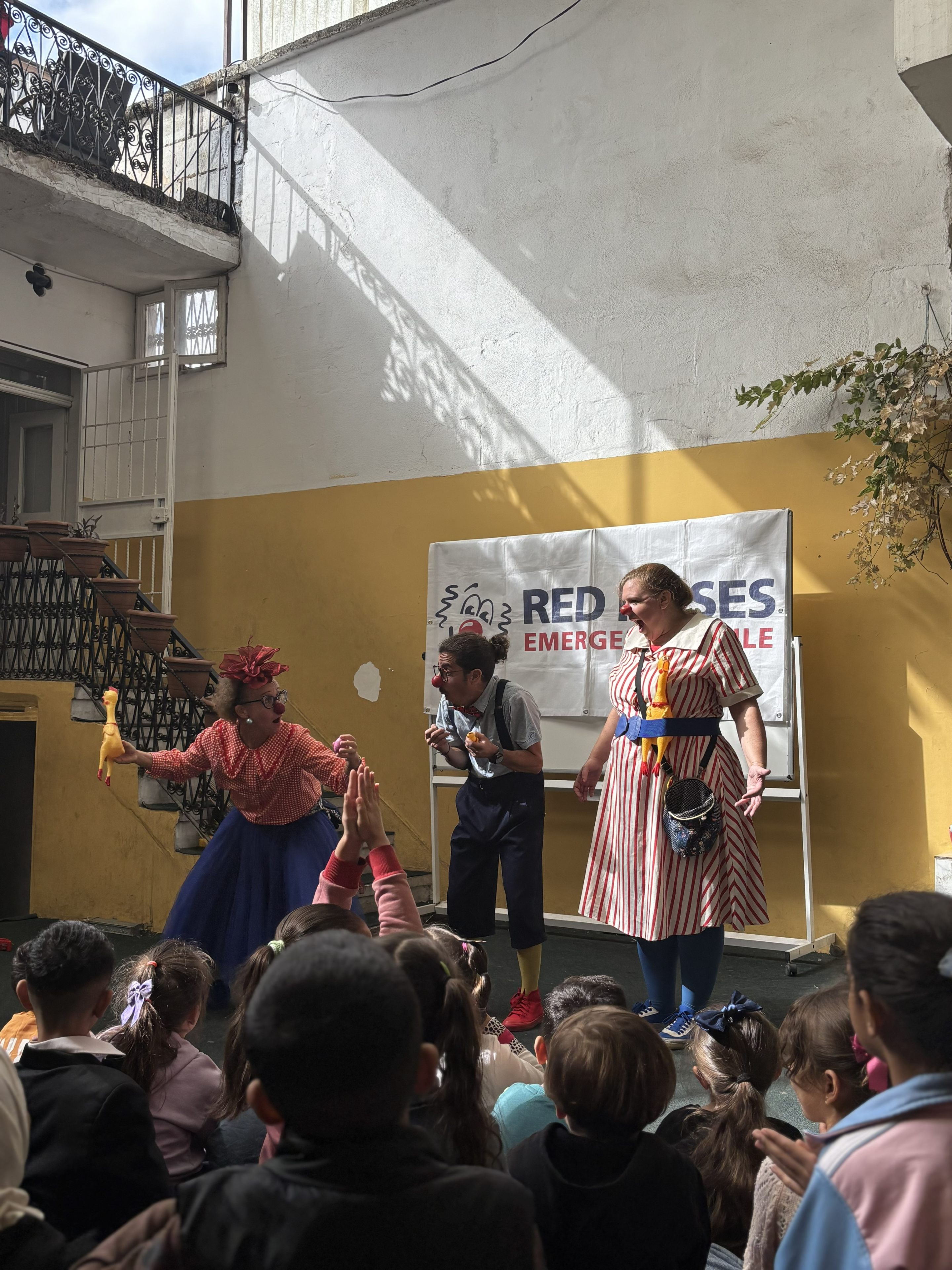 A highlight of the week was working with Be Child, an NGO supporting displaced communities in Türkiye, particularly Syrian children and their families. Housed in a small community centre in the heart of a Syrian neighbourhood, the space radiated warmth and care. Throughout the mission, the clown show was performed primarily in Turkish, allowing children to understand and interact fully. For Syrian children, Ezzat, a native Arabic speaker clown artist, translated key parts into Arabic, ensuring the performance was engaging and accessible for all. This thoughtful adaptation strengthened the connection between performers and audience.